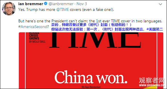 美国总统特朗普正在开启他的亚洲之行,但美国《时代》杂志却在最新一期的封面用中英双语打上了“中国赢了”(China Won)的大字,并在内页刊登《中国经济是如何赢得未来的》一文,作者布雷默(Ian Bremmer)是美国政治学者、政治风险咨询公司欧亚集团(Eurasia Group)的创始人兼总裁、《时代》杂志特约编辑,也是CNN、BBC、福克斯新闻等西方媒体的常客。