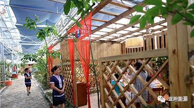 该餐厅占地4800平方米,集餐饮、光伏屋顶发电、智能化生态花园于一体,可同时容纳600人用餐。餐厅充分利用屋顶空间,合理布置光伏发电板的角度和位置,全部安装了多晶硅光伏发电板,按照当地平均日照时间估算,项目一年可发电约55万度。
