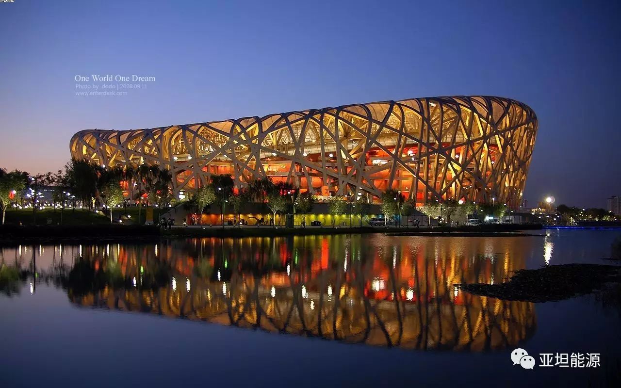 在“鸟巢”的12个主通道上方,安装了总装机容量130千瓦的太阳能光伏发电系统。虽然整体装机量并不是很高,但是在2003年之前的设计规划中就已经将光伏发电运用到体育场的设计建设中,这在国内已经属于比较超前的运用,而鸟巢的太阳能光伏发电系统产生的电力将直接并入国家体育场的电力供应系统,对奥运场馆的电力供应起到良好的补充的作用。