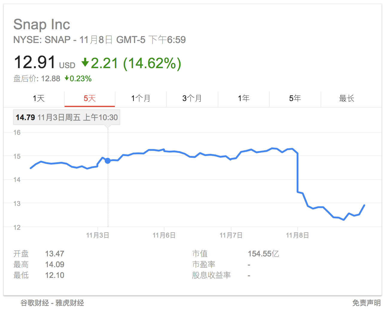 11月7日周二公布财报结果后,Snap在盘后即开始暴跌,7日收于15.12,而8日以13.47开,已经跌去10.9%。而今天Snap股价延续了下跌趋势,收于12.91,再次跌去14.6%。