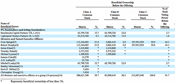 Snap的两位创始人Spiegel 和Murphy 平分全部的C类股票,再加上各自2%的B类股票,每人都拥有44.3%的投票权。这样的设计用以保证Snap公司的决策权掌握在创始人手中,不被外来投资者们稀释。