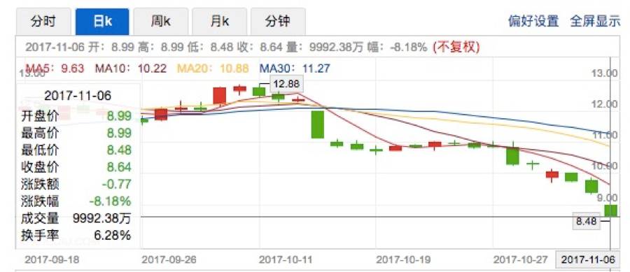 在10月16日跌停之后,网宿科技于11月6日再次大跌8.18%,报收8.64元/股。与10月9日12.75元/股的收盘价相比,该公司股价累计跌幅达32.24%。这意味着,在不到一个月的时间里,网宿科技股价的跌幅就超过了三成。
