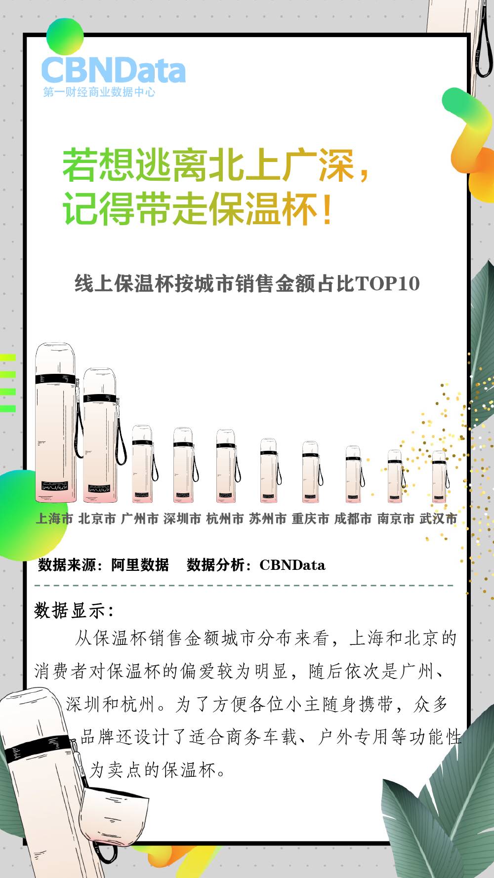 其实,除了玩儿摇滚的都爱保温杯,此等潮品也同样颇受城市白领的欢心。根据CBNData《研究》所显示的线上保温杯城市销售额分布来看,上海和北京的消费者对保温杯的偏爱较为明显,随后依次是广州、深圳和杭州。以方便随身携带、适合商务车载为卖点的保温杯,其实和城市的白领们很配哦!一不小心,成了北上广的标配呢~