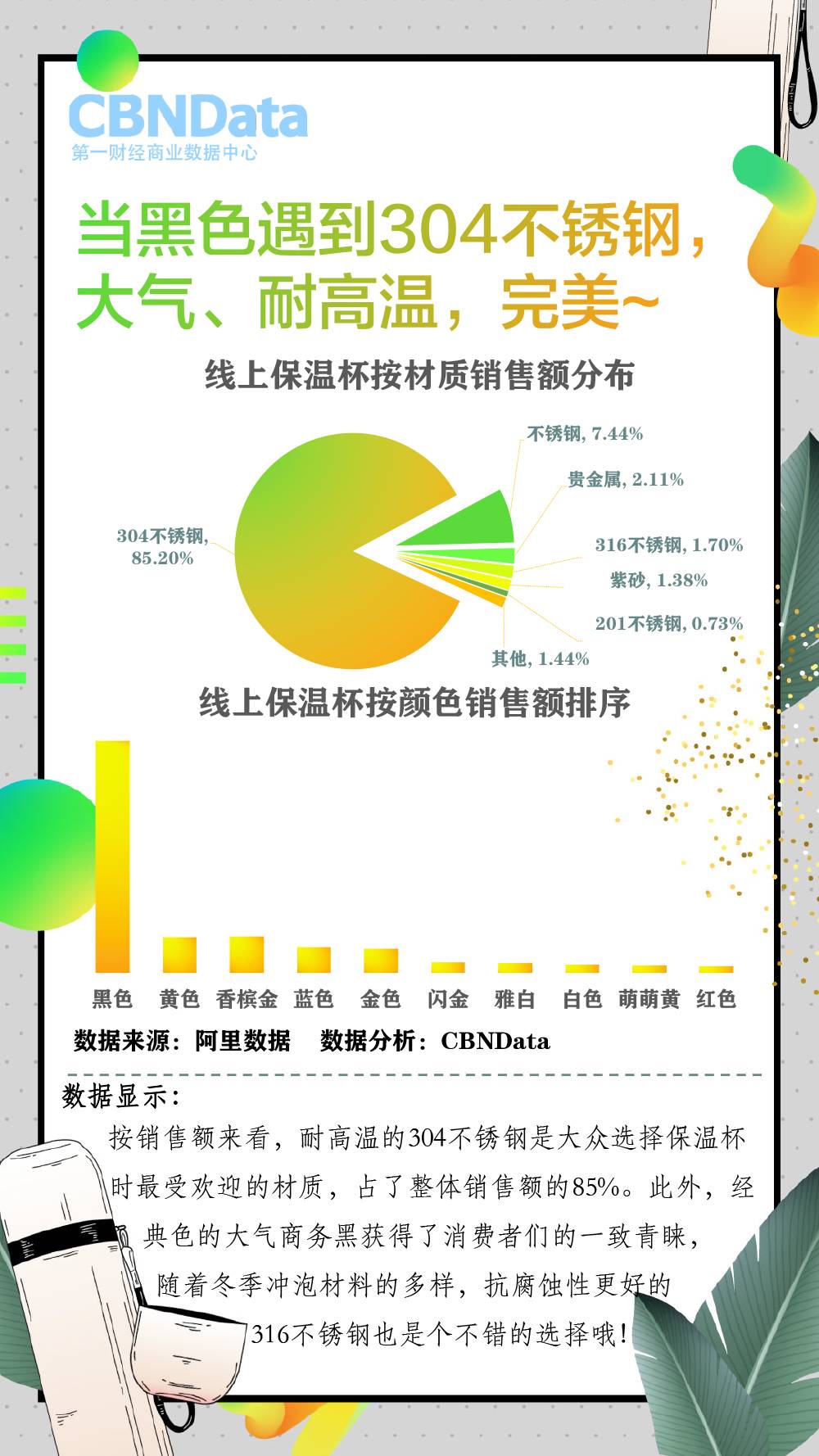 保温杯你泡了啥,决定你选购什么材质的保温杯。根据CBNData《研究》显示,按保温杯材质销售额分布来看,304不锈钢材质的保温杯最为大众所爱,占了整体销售额的85.2%,看来大多数人还是青睐保温杯的耐高温属性。如果为了证明自己保暖杯里泡的不是热水,而是各种好味即冲饮品,那抗腐蚀性更好的316不锈钢更适合嘞!