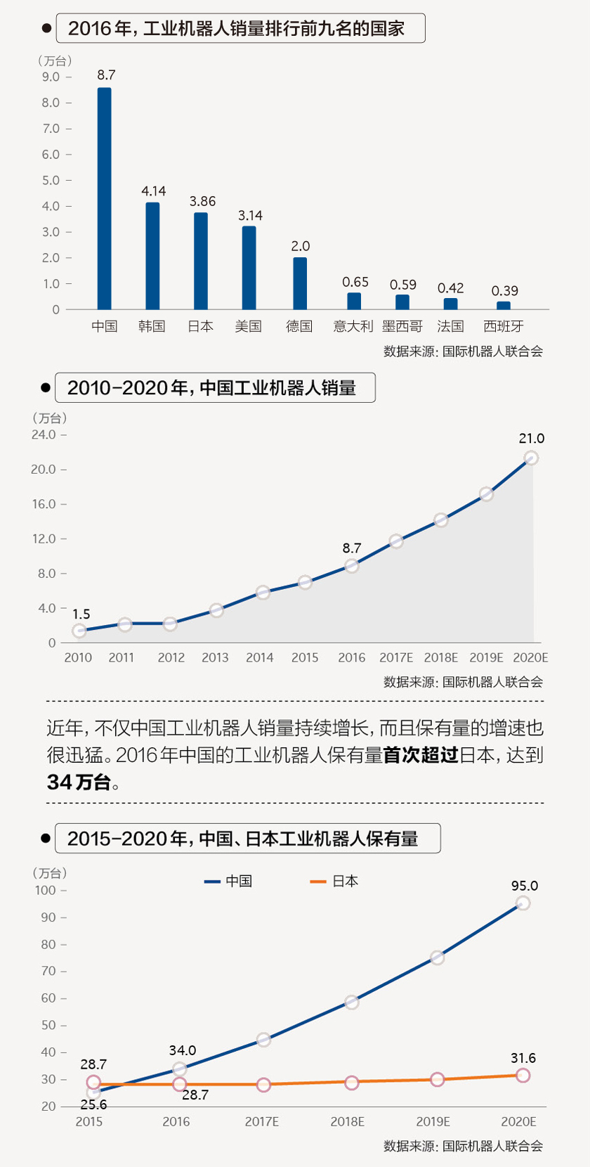 2016年中国工业机器人保有量首超日本,未来增势仍将持续。