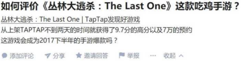 需要注意的是,这些天宣传十分高调的吃鸡手游如《小米枪战》《荒野行动》,并非为第一批尝试吃鸡的手游。在他们之前还有一整支队伍,有四五款同类产品的数据相当不错,其中《光荣使命》的前身《丛林大逃杀》,是首个在TapTap上达到百万预约以上的游戏。