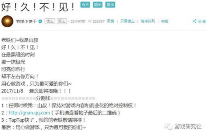 这种“卖人设”的策略,在用户数量快速增长但又相对封闭的TapTap社区极为奏效。山叔成了社区里的偶像、明星,成了《光荣使命》的精神图腾,一言九鼎,被奉为绝对的真相,抢到跟帖前排的人甚至会激动不已。直到今天,你去《光荣使命》的社区论坛,依然能看到很多为山叔打Call,尽管在TapTap之外,没人听说过山叔。