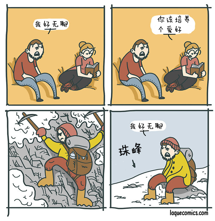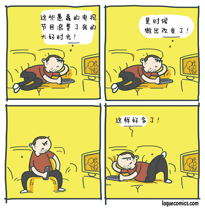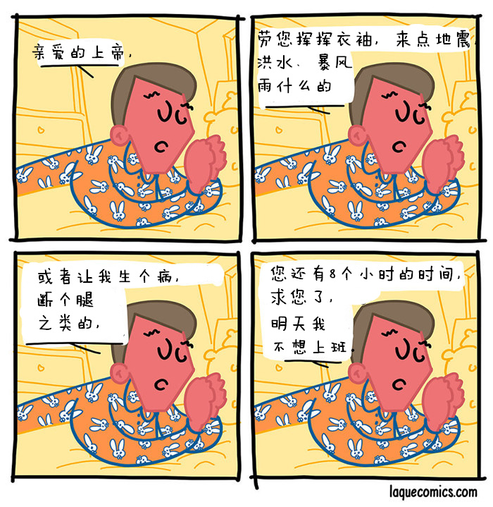 我通常都是画四格小漫画,没有固定主题。从日常工作到一些很蠢的想法,或者从臆想出的人物到工作生活的种种。我画漫画的唯一标准就是首先要把自己逗笑。