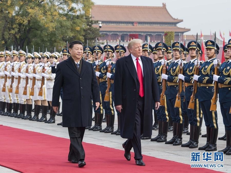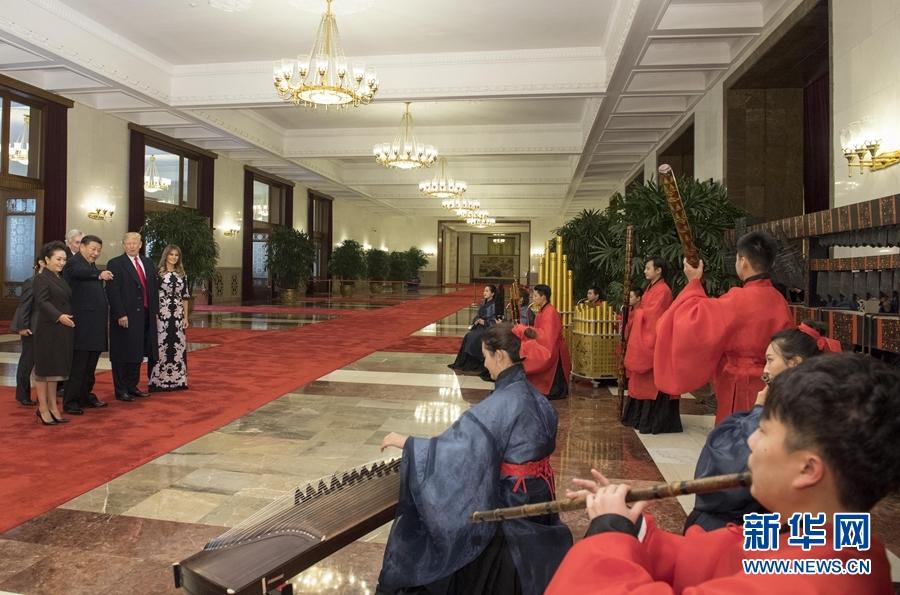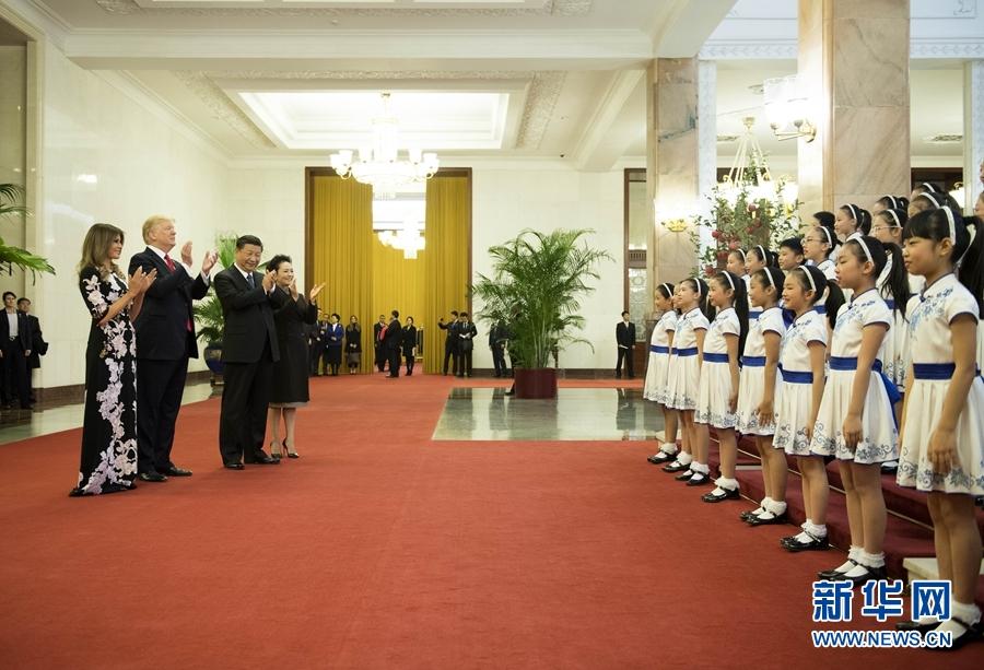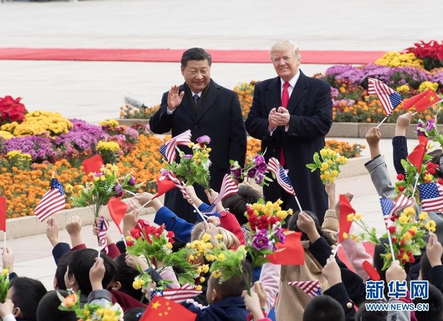 会谈前,习近平在人民大会堂东门外广场为特朗普举行欢迎仪式。习近平主席夫人彭丽媛,中共中央政治局常委、国务院副总理汪洋,中共中央政治局委员、中央书记处书记、中央办公厅主任丁薛祥,中共中央政治局委员、全国人大常委会副委员长王晨,中共中央政治局委员、中央财经领导小组办公室主任刘鹤,国务院副总理刘延东,中共中央政治局委员、国务委员杨洁篪,中共中央政治局委员、中央书记处书记、国务委员郭声琨,全国政协副主席董建华,全国政协副主席万钢等参加。