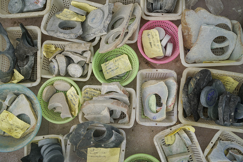 玉雕铺子里摆满玉石毛料。主人把想要的形状、取货日期写在一张便签纸上。尽管一个翡翠手镯的售价可能高达十几万,但在玉雕铺子里,他们的待遇也只是被摆放在一个个塑料框中。