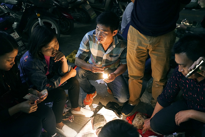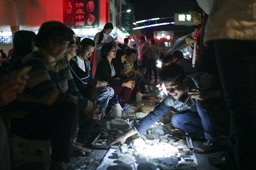 卖家在市场的人行道上摆地摊,石头就放在地上供人挑选。每天晚上,数百名卖家赶到这个市场参与交易。