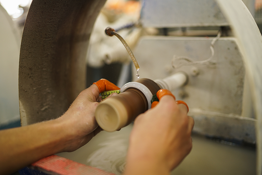玉雕师在加工手镯。赢家把石头就近送往市场里的玉雕铺子,玉雕师按主人的要求把玉石加工成各种成品。
