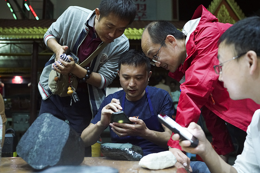 夜里11点,赌石市场上仍然人头攒动。行家把路边赌石称为“捡漏”。虽然“捡漏”成功的概率不高,但市场里流传着“捡漏”高手以数百元的价格买下一块半个巴掌大小的石头,开出极品玻璃种一夜暴富的故事。