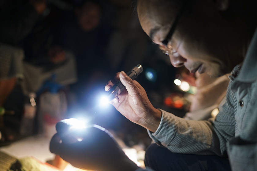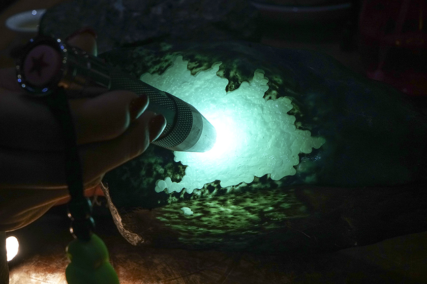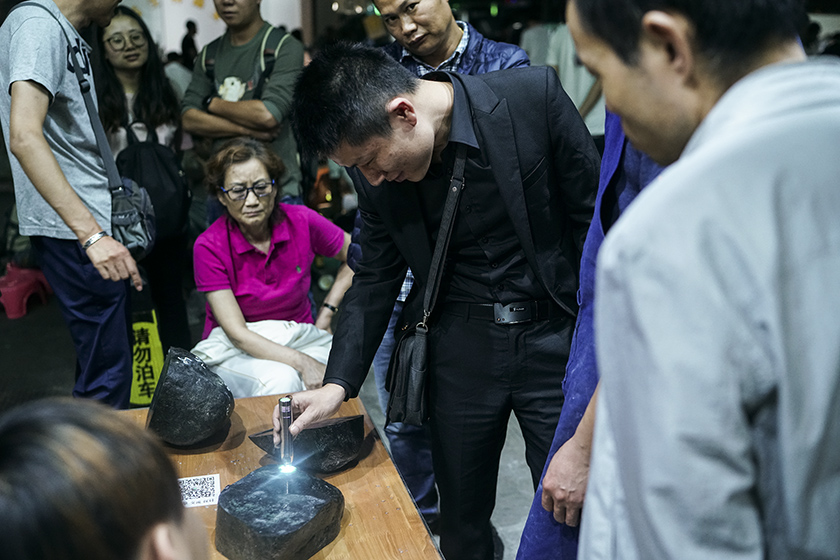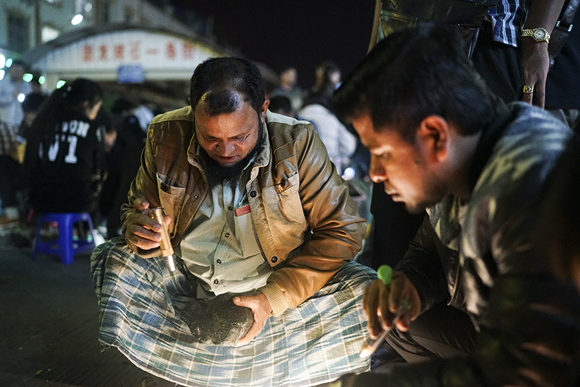 市场里的玉石雕刻师张建波在切开石头的位置用手电观察着。买家通常会当场把买好的石头拿到给玉雕师切开。如果赌赢了,玉雕师会为买家放炮、放礼花。