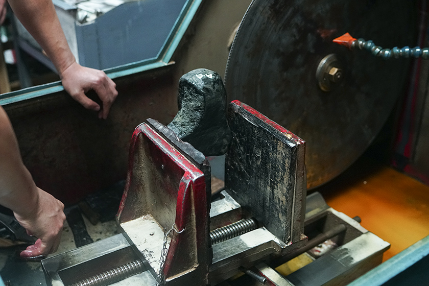 张建波把一位顾客的石头固定在切石机上。锋利的圆形刀片可以切开坚硬的翡翠。