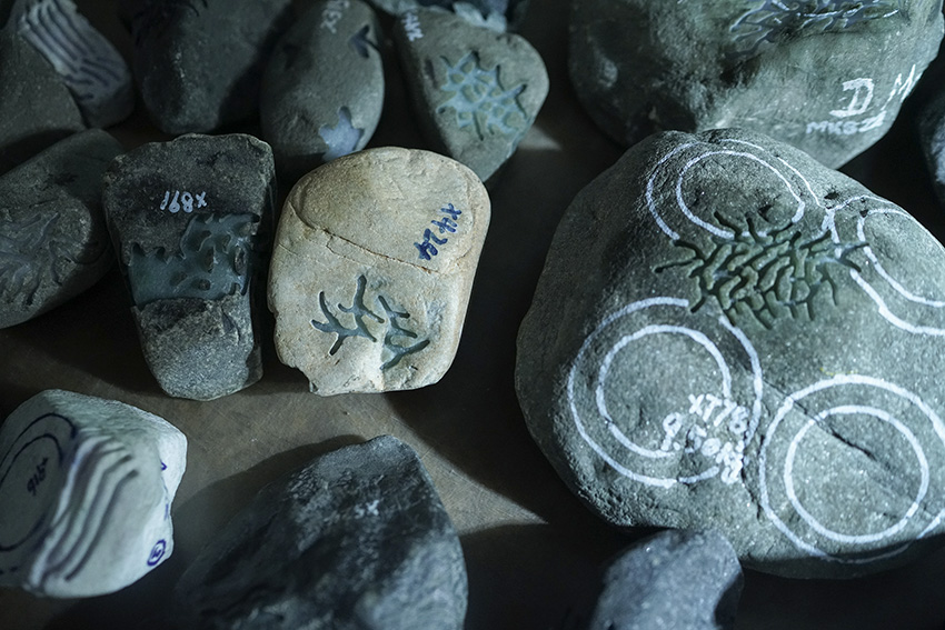 赌石的风险很高,一块其貌不扬的石头有可能被卖家开价数百万元。为了促成交易,买家可以全赌,也可以半赌。全赌即纯天然的原石,半赌则是在原石上打掉一部分表皮,方便买家观察。图中石头表皮上的花纹即打掉的一层薄薄的表皮。当然,半赌的石头售价更高。