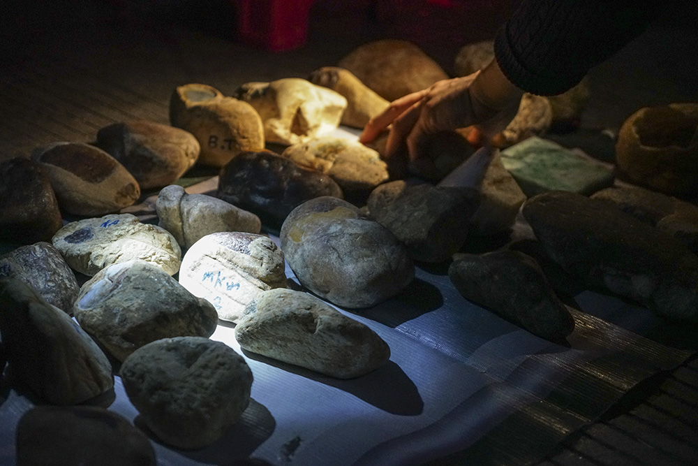 一位买家用赌石专用的强光手电照射石头。强光手电只能照到石头表层下浅浅的一层,买家对石头内部的情况一无所知,“赌”的乐趣就在于此。