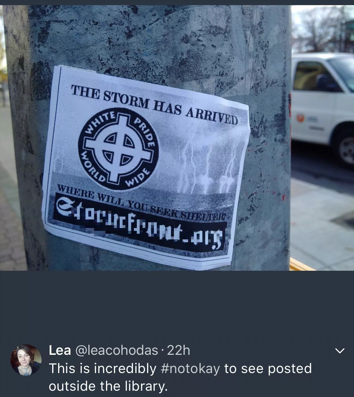 而如今,这些曾遭到无数人唾弃和谴责的极右翼纳粹组织似乎又死灰复燃了。这次他们选择在另一个华人聚集的地方作妖:本拿比(Burnaby)市的铁道镇购物中心(Metrotown)中心旁的本拿比公共图书馆(Burnaby Public Library)。传单上写着:“暴风雨即将来临(the storm has arrived),你将在何处寻找安身之地?(where will you seek shelter?)”并印有白人至上图案。
