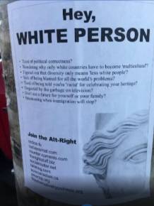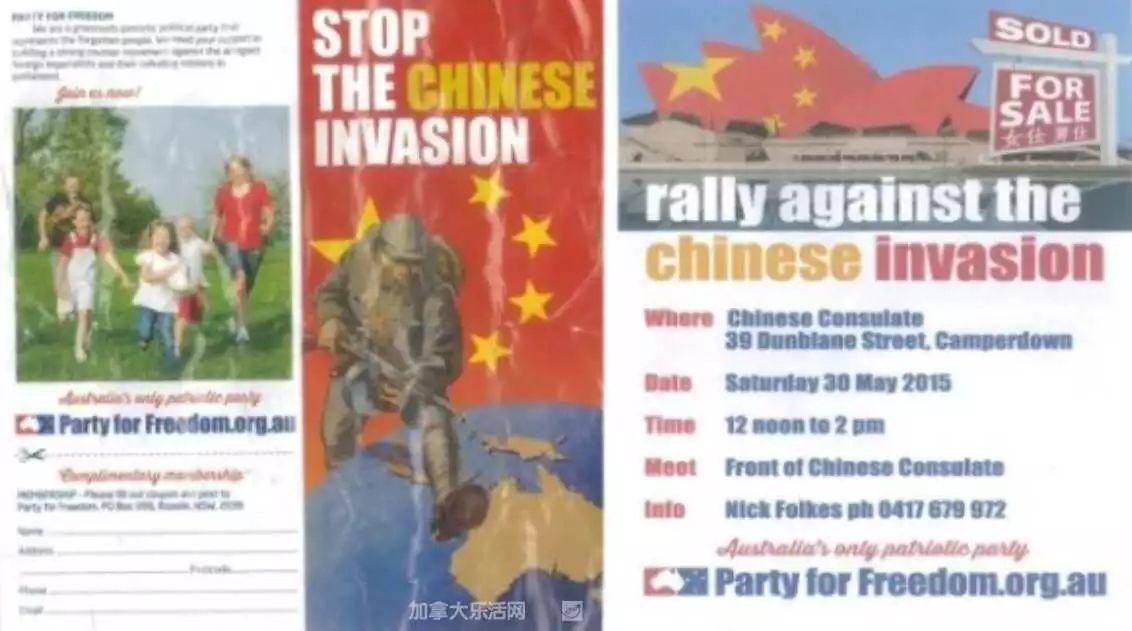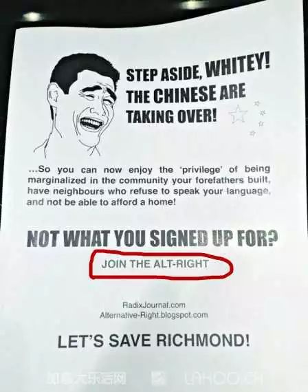 去年11月,列治文和温哥华西区等地陆续出现了一些白人至上的排华传单,有的公然张贴在街道上,有的投放在居民的邮箱中,更有甚者直接敲门派发。这些传单上面印着姚明的头像和中国国旗图案,用黑体字写:“白鬼(Whitey)靠边站吧!中国人正在接管我们的城市!”传单上还说,华人人数增加导致白人被边缘化,(华人)邻居拒绝说英语,白人连房子也买不起,号召反对这一现象的人一起加入他们的对抗活动。