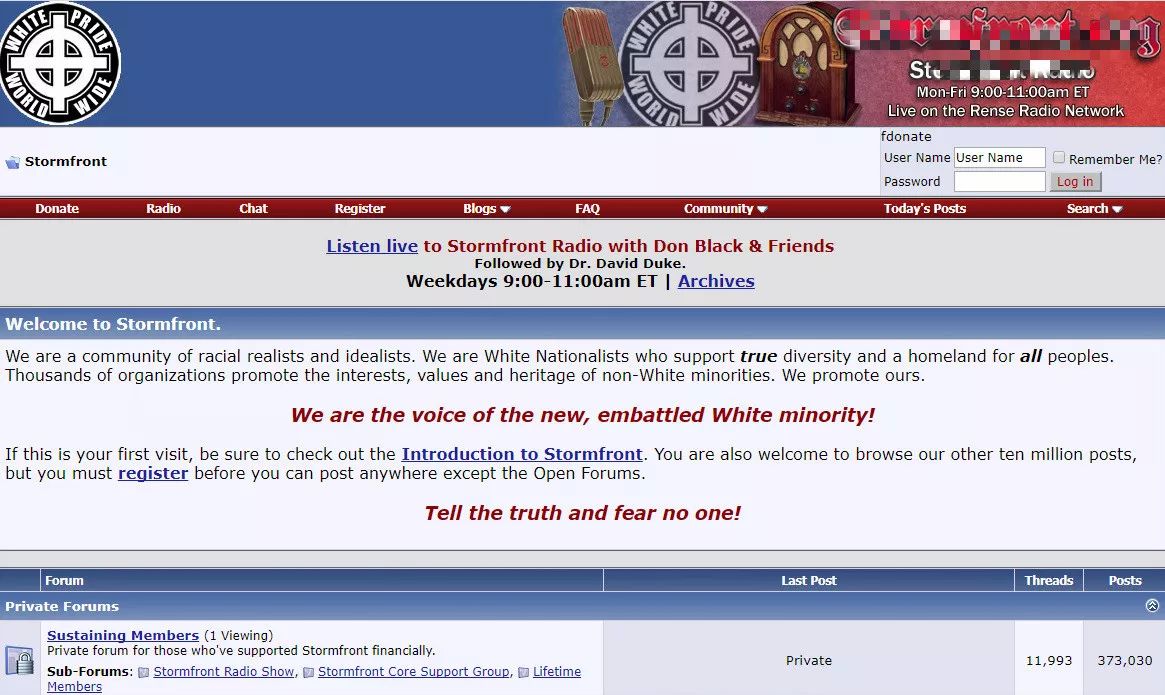 这次的右翼组织叫Stormfront,由著名极右翼组织,3K党(Ku Klux Klan)的一名前组织者于1995年创建,注册会员超过30万人,是网络上最早活跃的一批白人至上、极右翼组织之一,但最近该网站已经关闭。臭名昭著的3K党是北美历史上种族主义的急先锋,四处宣扬反政府、种族主义和排外主义等,而Stormfront的核心性质也不离其宗。