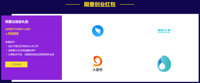 阿里云限量创业红包,针对阿里云新用户,创业礼包内包含钉钉、大鱼号、淘宝众筹、芝麻信用等为企业提供的服务