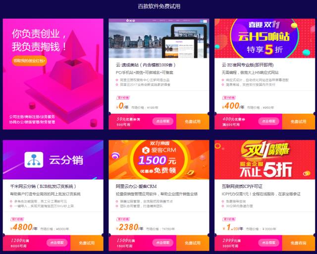 非常为消费者钱包考虑的阿里自然不会只有一份大礼包,在阿里云双十一创业节上,近百款软件均可免费试用,但如果试用好用的话,请领券以低价备齐创业所需产品和服务。