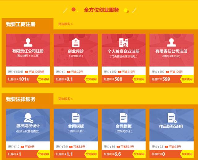 同时腾讯创业节分为主会场、精选服务会场、腾讯服务分会场、大学生创业分会场等四个,提供包括工商注册、知识产权、法律和财税服务等具体企业服务。