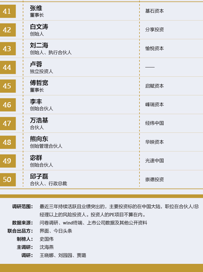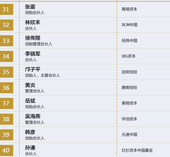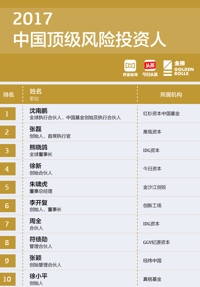 2017年11月21日,北京——界面联合今日头条首次推出“中国顶级风险投资人”榜单,共有50位顶级风险投资人上榜。排名第一的是红杉资本中国基金创始及执行合伙人沈南鹏,排在第二的是高瓴资本的创始人张磊,IDG资本全球董事长熊晓鸽则位列第三。今日资本创始合伙人徐新、金沙江创投董事总经理朱啸虎、创新工场创始人李开复、IDG资本合伙人周全、GGV纪源资本管理合伙人符绩勋、经纬中国创始管理合伙人张颖、真格基金创始人徐小平则分列第四至第十位。另外晨兴资本创始合伙人刘芹、独立投资人王刚、昆仑万维董事长周亚辉、源码资本创始合伙人曹毅、海纳亚洲合伙人王琼都有非常精彩的表现。