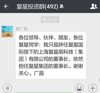 “我还年轻,还没想退休。大家赶紧关注双十一抢购吧!我只是辞任复星国际旗下的上海复星高科技(集团)有限公司的董事长,依然担任复星集团的董事长。再次谢谢大家对复星和我本人的关心。”11月10日晚间,微信公众号《广昌看世界》作出了上述回应。