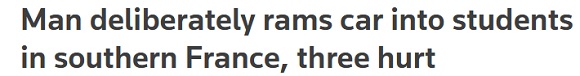 【法国一男子驾车冲撞人群 导致三名中国学生受伤】周五,法国南部城市图卢兹附近,一名男子故意驾驶轿车撞向学校外面的人群,导致三名中国学生受伤。