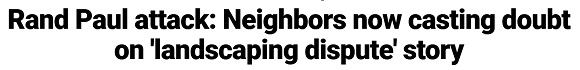 【美国参议员遇袭案:邻居质疑庭院纠纷说法】一周前,美国参议员兰德·保罗(Rand Paul)与邻居起纠纷,被打断六个肋骨入院治疗。目前开始有更多的邻居对有关纠纷是因庭院景观而起的报道表示怀疑。