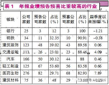 而除了银行股和钢铁股,建筑装饰、交通运输、汽车、轻工制造、医药生物、建筑材料行业的年报预喜比重也相对较高,目前也均超过了80%。