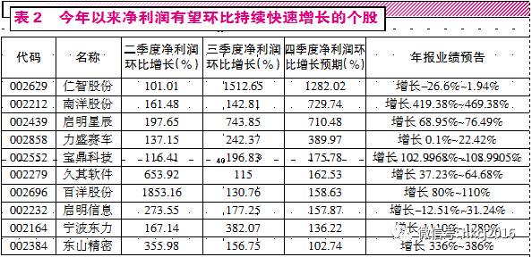 因此,我们试图从年度业绩预喜的公司中,寻找四季度环比也有望实现增长,近期业绩同样处于快速成长中的个股,以供投资者参考。根据目前已公布年报预告给出的利润预期值统计,有727家公司在全年业绩预喜的前提下,今年四季度也有望实现利润的环比增长。从预增幅度看,北京科锐的四季度净利润环比预增幅度较高,如果以预告中5735万元的预告下限统计,四季度环比增幅也高达约6273.72%。统计数据显示,目前已公布年报预告的公司中,有198家公司有望在今年各季度实现利润的持续环比增长。其中,67家公司每个季度的增长始终保持在30%以上;38家公司各季度净利润环比持续增长超过50%;仁智股份、南洋股份、启明信息等10家公司,今年以来各季度的环比增速更是始终实现了翻倍增长。