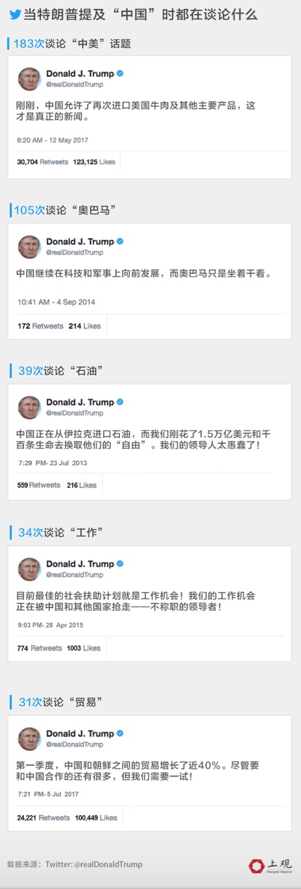 入主白宫以后的特朗普变得更加务实。当选美国总统后的这一年,三天两头爱发推“开炮”的特朗普,只发了2193条推文,还不及去年的一半。但提到中国的次数却是去年的两倍,中国更加重要了。