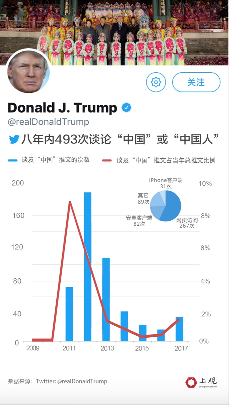 为期三天的国事访问,特朗普为此发了9条推文,甚至激动地连换了两次封面图片,这是他当选美国总统以后关于中国发推最多的一次。 “推特论战”是特朗普最爱的一张牌,外交方面也不例外。六年来特朗普总共发布了493条关于中国的推文,使中国成为了美国总统最常挂在“嘴”边的外国国家,伊朗、俄罗斯、墨西哥、伊拉克排在其后。