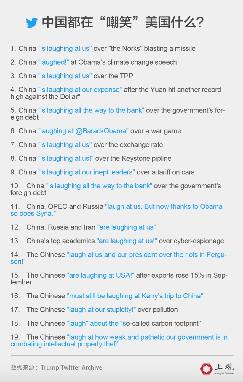 有趣的是,特朗普提到了28次“嘲笑”,这次并不是他嘲笑别人,而是“中国正在嘲笑我们……”。八年来中国在这些事情上都“嘲笑”过美国:跨太平洋伙伴关系协定、人民币汇率、美国债务、出口贸易、碳排放、污染等。细看这些推文,特朗普在借中国来“嘲笑”讽刺奥巴马政府,表达对美国现状的不满。
