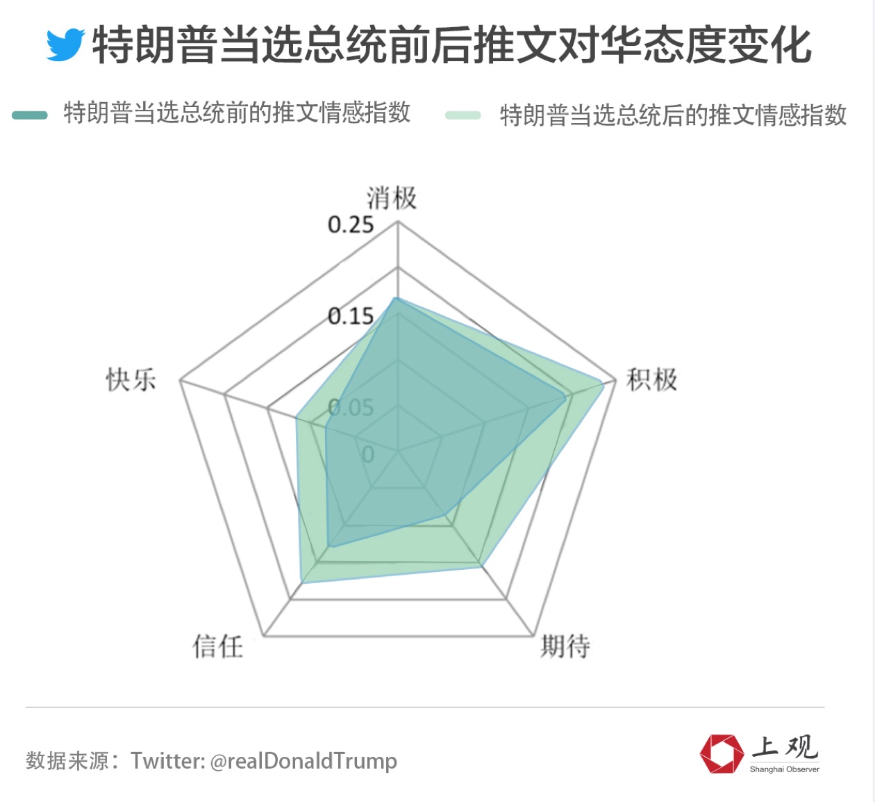 当对比了特朗普当选总统前后的推文态度发现,即使身份发生变化,特朗普对华“消极”态度依旧强烈,但也有明显的积极倾向。“积极”态度提高24%,“信任”态度提高40%,“期待”态度转变最大,提高了83%。特朗普看待中国和中美关系更加积极、快乐了,怀着满满的信任和期待。所以这次特地带着贸易代表团来访华,与中国签署了2535亿美元的经贸合作协议,打破中美经贸合作记录。