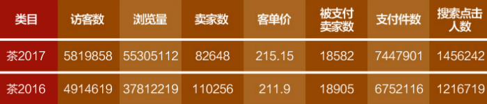 根据数据显示,2017年淘宝双十一茶叶全品类访客数较去年上升90余万,游览量上升1.7千万,客单价上涨3.25元,支付件数多出近70万,搜索点击人数提高23万。
