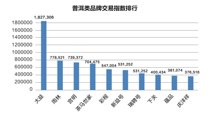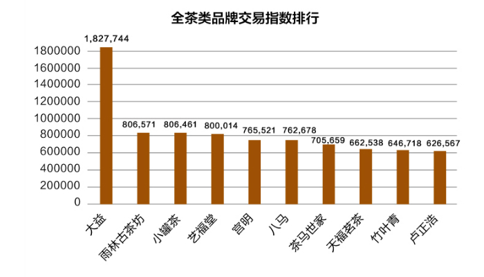 全茶类的交易指数中,大益以1,827,744的绝对优势位列品牌第一,第二名的雨林古茶坊806,571与第三名小罐茶806,461相加都不及大益单一交易指数。