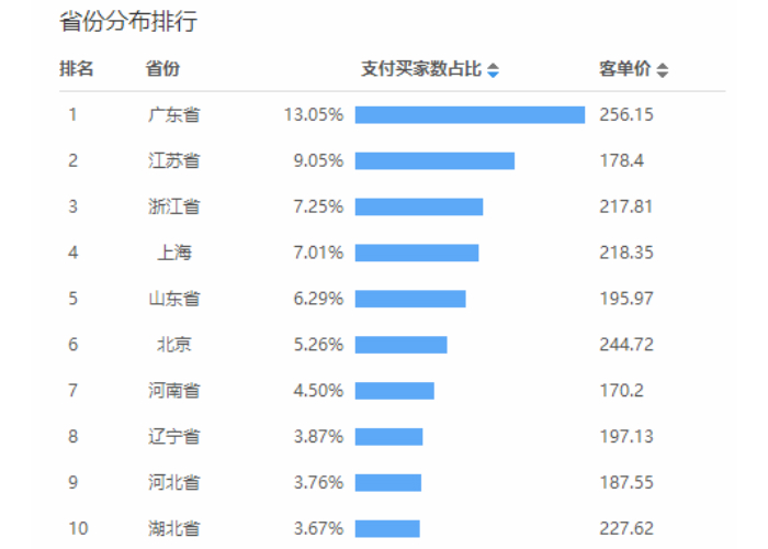 而在消费地区方面,广东省占到了全国的十分之一,而且客单价也以256.15元成为第一,高出平均客单价41元。而内陆城市湖北省的客单价也达到了227.62元。