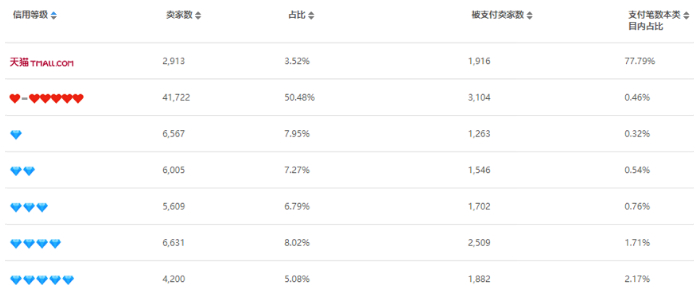 而只有几颗星级别的淘宝店,一般为新注册的淘宝店及成交量低的淘宝店,他们在整体淘宝茶叶销售店中占比达到了50.48%,但支付笔数本类目内占比仅有0.46%。