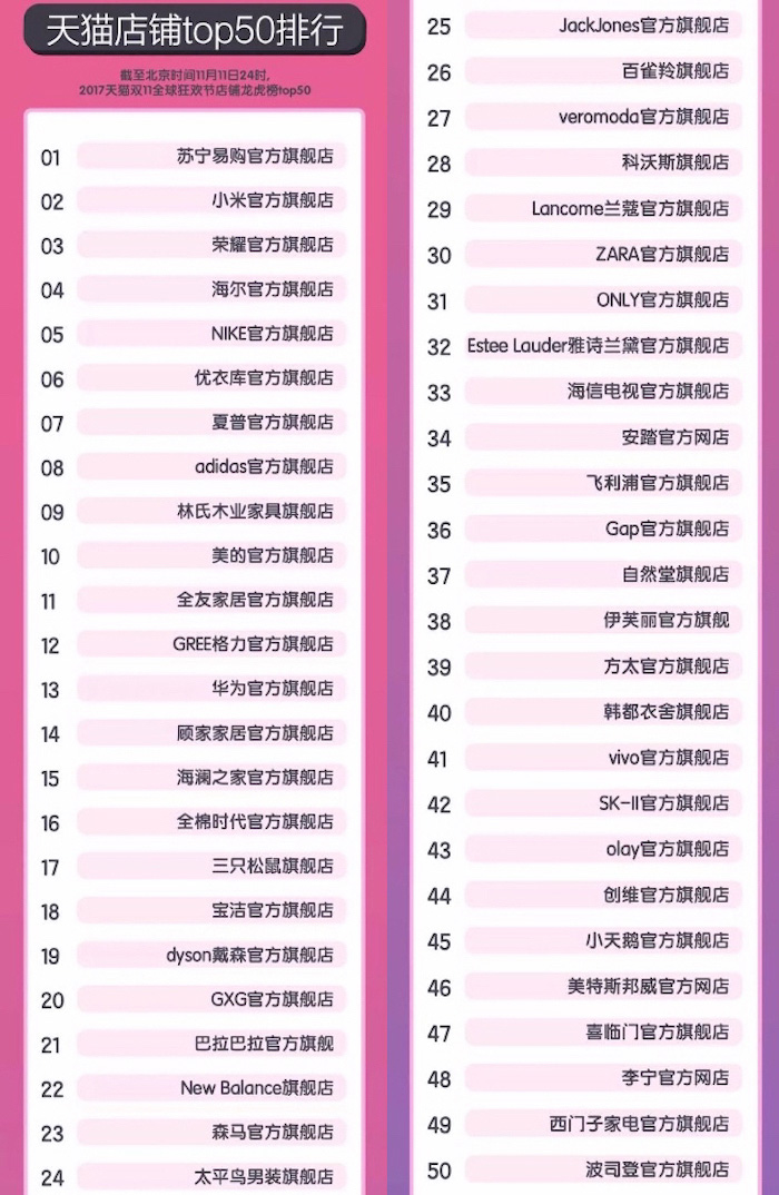 而在今年消费升级大趋势和新零售业态的带动下,消费者对于品牌的选择也出现了一些新变化。通过阿里巴巴发布的2017年“天猫双11全网TOP50排行榜”以及各类目排行榜,让我们来看看哪些品牌在今年的大战中胜出了: