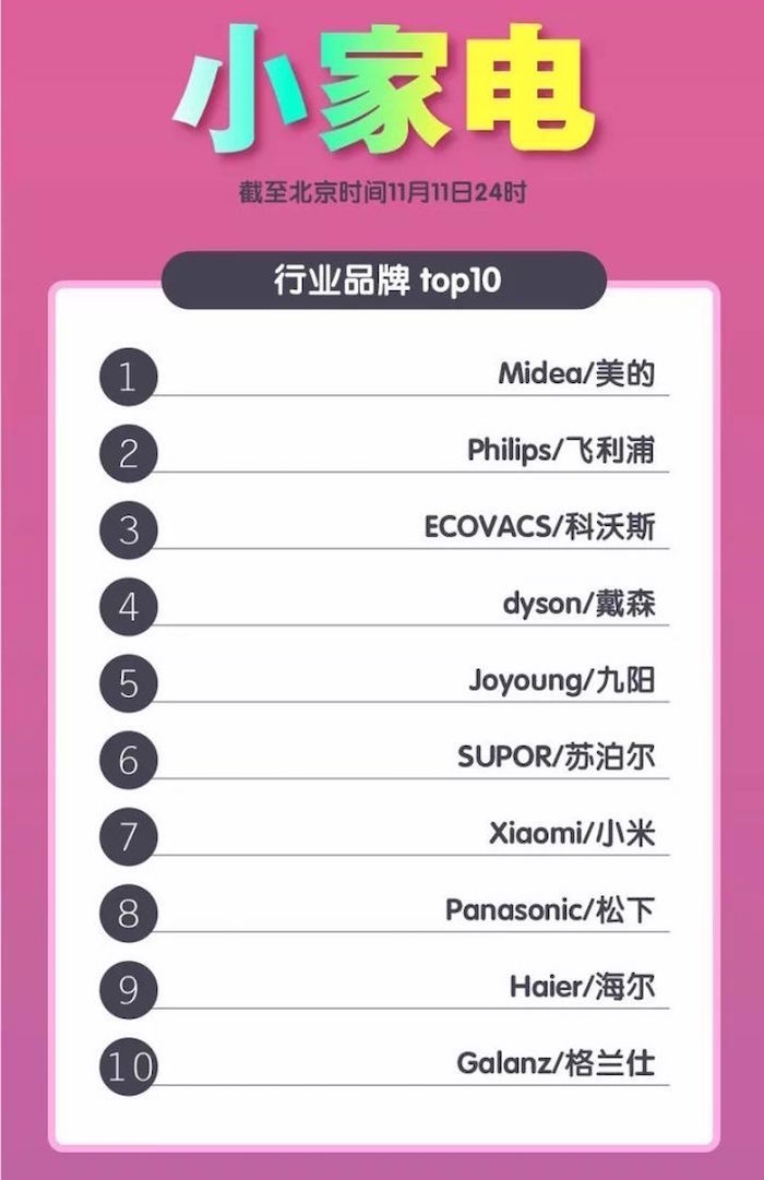 美的排名第一,位列第二的飞利浦在照明、医疗、生活小家电方面一直口碑不错,双十一之前还推出了新品空气净化器。而科沃斯扫地机器人、戴森吹风机冲进榜单前五,也是消费升级最强的佐证之一。