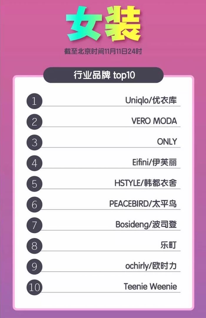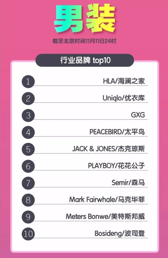 以男装为主业的海澜之家位居第一,双十一开始不到1分钟,海澜之家就与耐克几乎同时实现了销售过亿,这离不开海澜之家与天猫在新零售上的深度探索:今年8月海澜之家与阿里签署了新零售战略合作,旗下5000家线下门店已升级为新零售“智慧门店”。优衣库排在第二,其线上线下一体化的“新零售”运营策略对销量有促进作用,优衣库全国500多家门店都将支持天猫下单,最快24小时内门店备货完成服务。