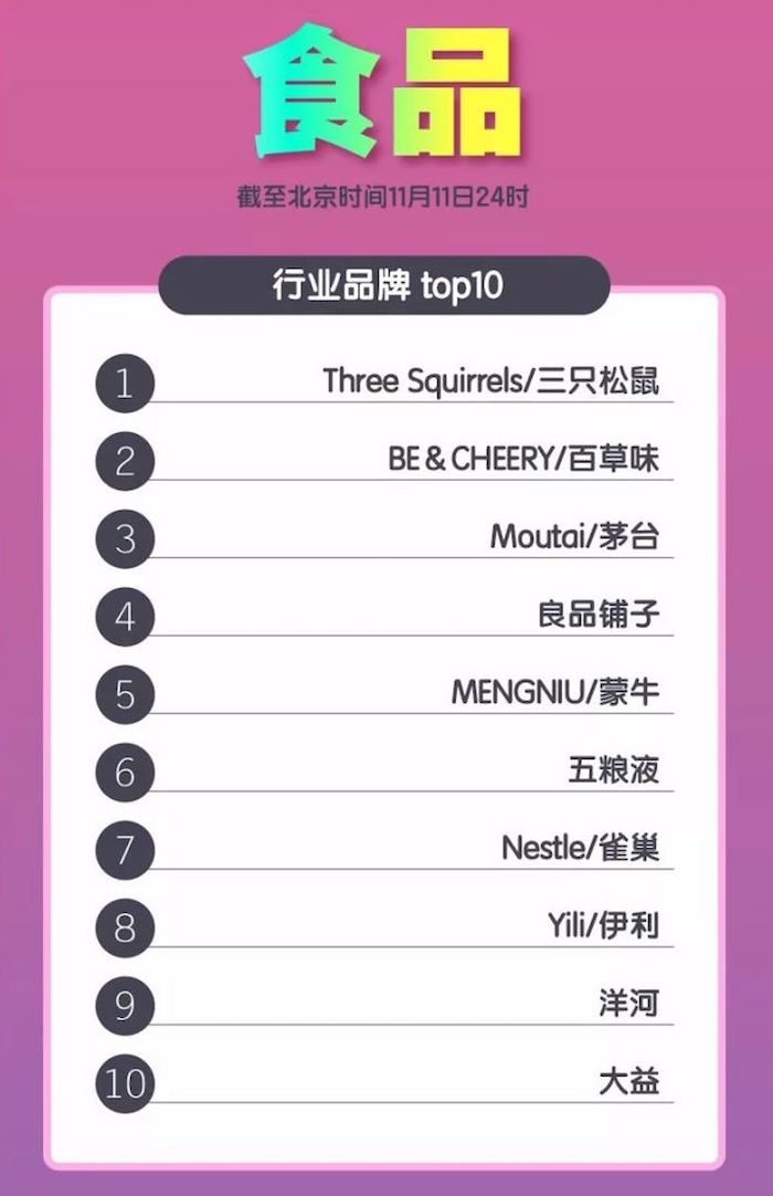 除了零食,三家酒水上榜,其中茅台排在食品类第三,五粮液、洋河分列第六和第九。奶品中蒙牛排名居首,位列第五。