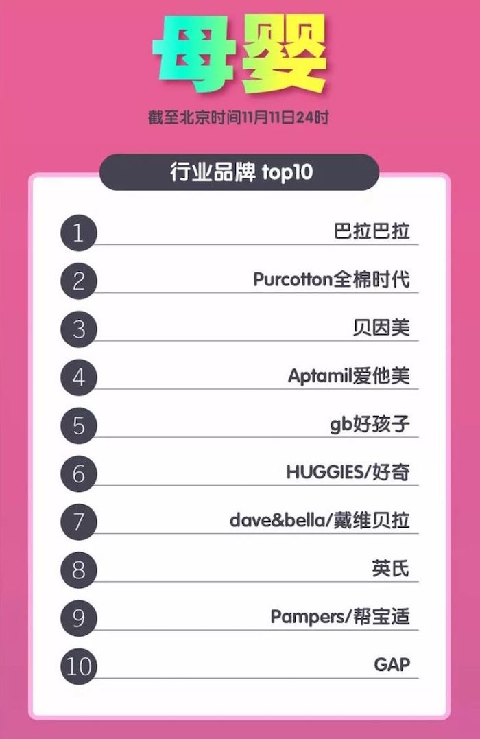 去年位居童装品牌第一的巴拉巴拉,今年在母婴品类中排名第一,数据显示品牌不到8小时成交额便超越去年全天数值;排名第二的全棉时代,销售额达4.06亿元,超越去年的2.6亿元,同比增长56%,婴儿纯棉柔巾、居家纯棉柔巾等产品甚至出现库存告急;母婴中排名第三的贝因美同时是奶粉类销量冠军。