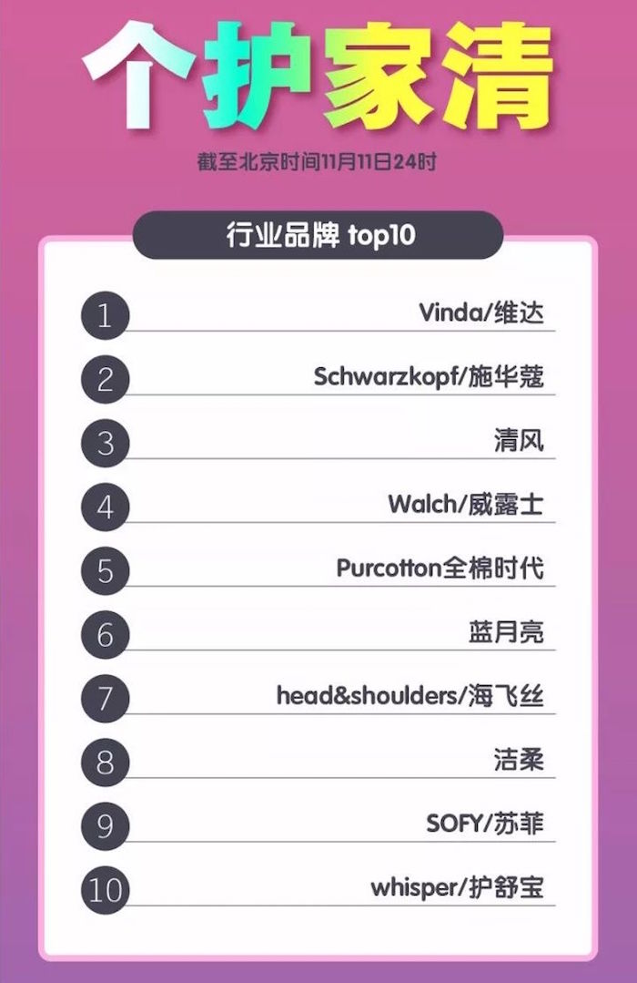 个护品类中,维达、施华蔻、清风排名前三。维达从去年的第四名跃升第一,离不开其在电商渠道方面的投入,截止今年上半年,维达电商销售渠道收益增长在各销售渠道中表现最为突出,占集团总营业额20%;此外,消费升级趋势下,品质口碑较好的全棉时代今年挺近前五,数据显示,今年双十一全棉时代天猫旗舰店单店单日的销售额达4.06亿元,超越去年的2.6亿元,同比增长56%。