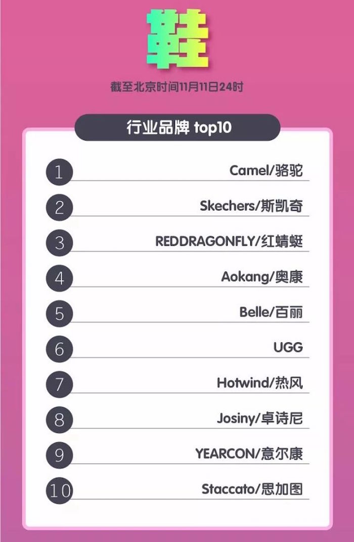 排名第一的耐克取得了不俗的成绩,在今年双11开始后不到1分钟成交量过亿,耐克官方旗舰店也是天猫服饰史上首个破10亿的商家,而耐克与阿迪达斯两家品牌均在1个小时内超过去年全天成交额;排名第三的安踏销售额为6.7亿,较去年提高66%。