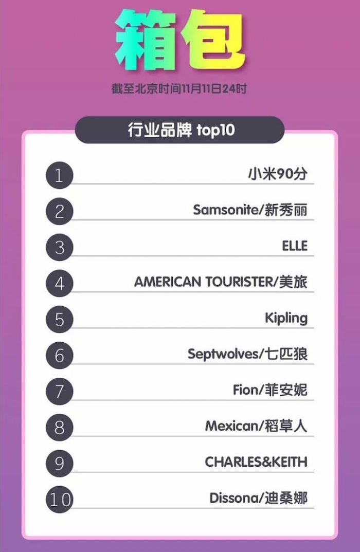 此前一直是天猫箱包类预售榜冠军的“小米90分”,位列箱包品类第一,超过了新秀丽、美旅等国际品牌。“小米90分”是小米生态链家族的品牌,以高颜值和性价比吸引了不少消费者。