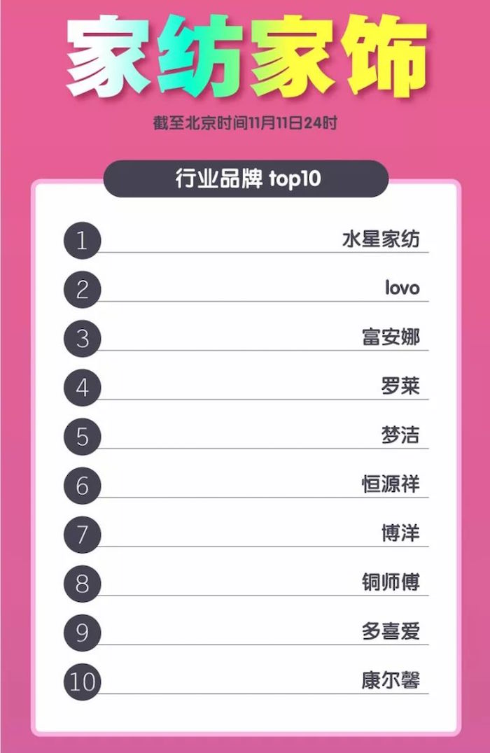 家纺家饰品牌的竞争也相当激烈。曾经连续六年销量居首的罗莱家纺今天裂变成了两个品牌:lovo和罗莱,分别排名第二和第四。这让去年的排名第二的水星家纺看起来今年排在了第一,不过事实上罗莱家纺两个品牌加起来的销售首次突破2.5亿,依然是表现最好的家纺品牌。在这次榜单中,第一次上榜的还有恒源祥。